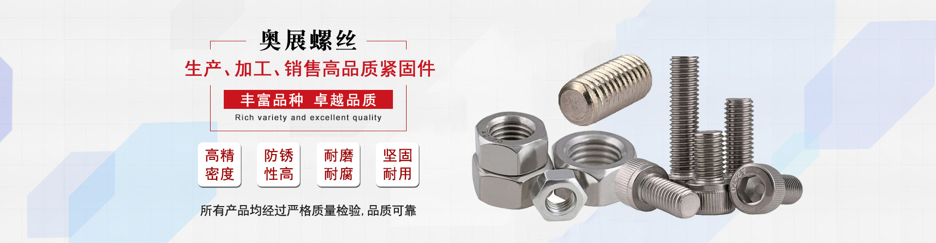 奧展公司是一家集生產、加工、銷售、服務為一體的大型專業緊固件國家高新技術企業,專業各類高品質螺絲、螺母等精密緊固零部件供應商,公司自成立以來憑借長期經營管理經驗及雄厚的實力,承接各種非標定制。